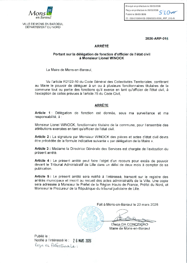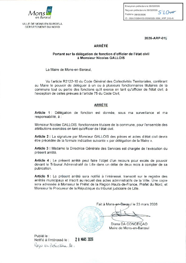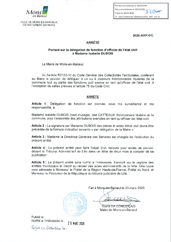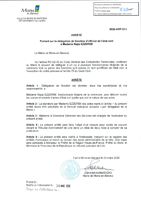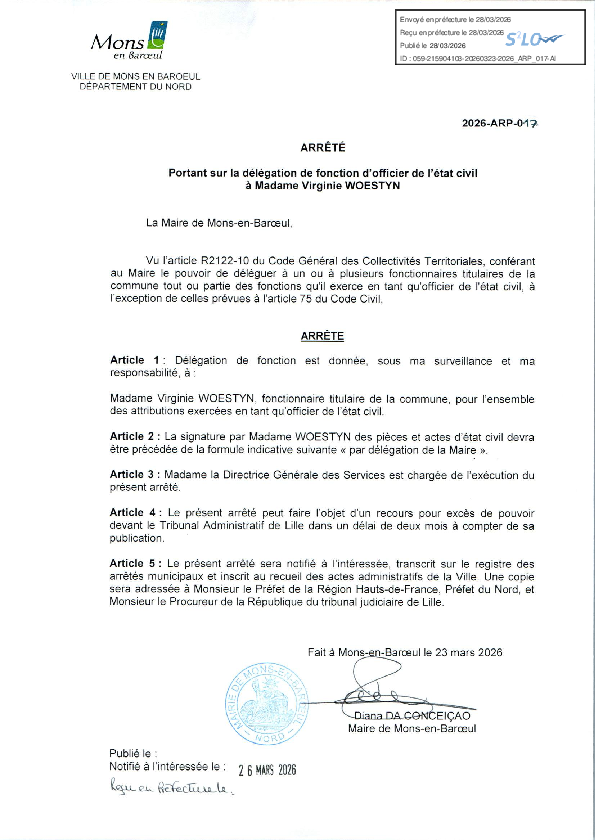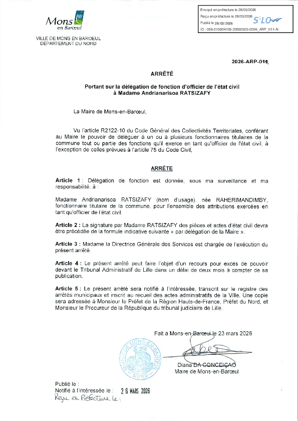Délégation de fonction et de signature à Mme Rosemonde DOIGNIES-2e adjoint