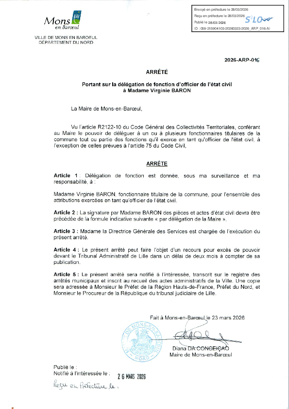 Délégation de fonction d'officier d'Etat Civil à Madame Idalia Brito - publié le 16/11/22