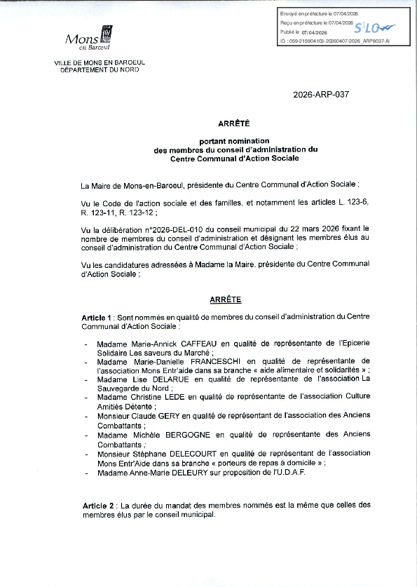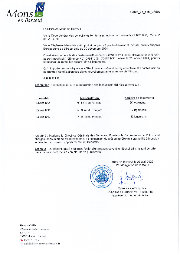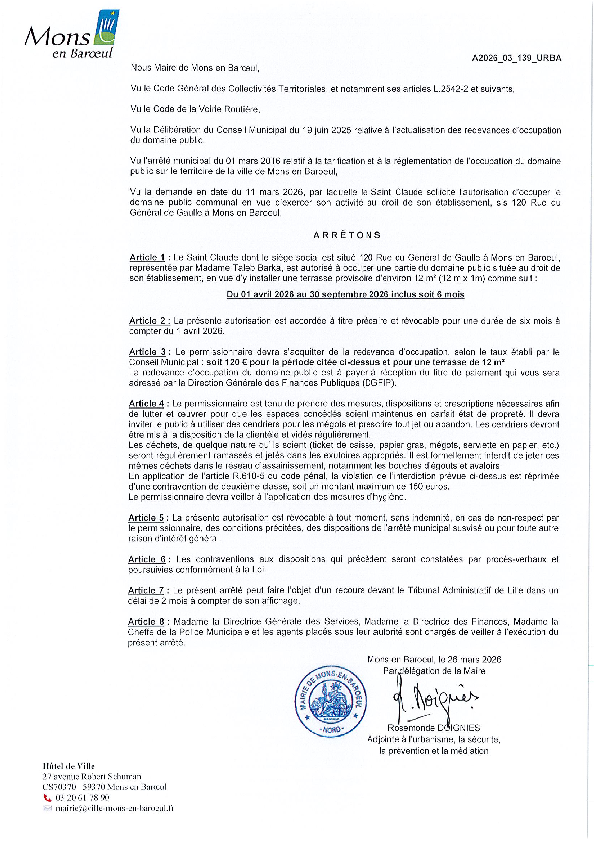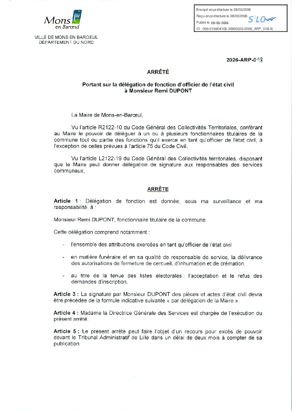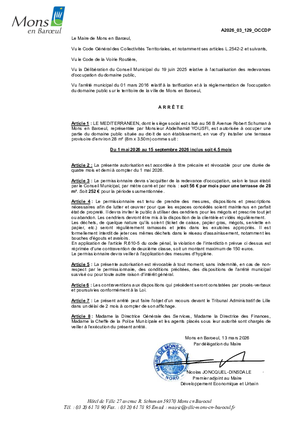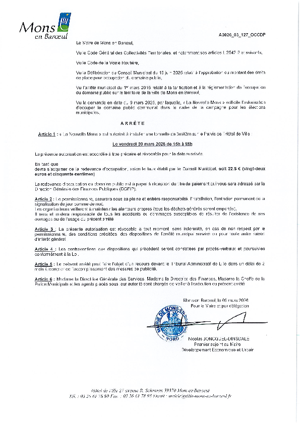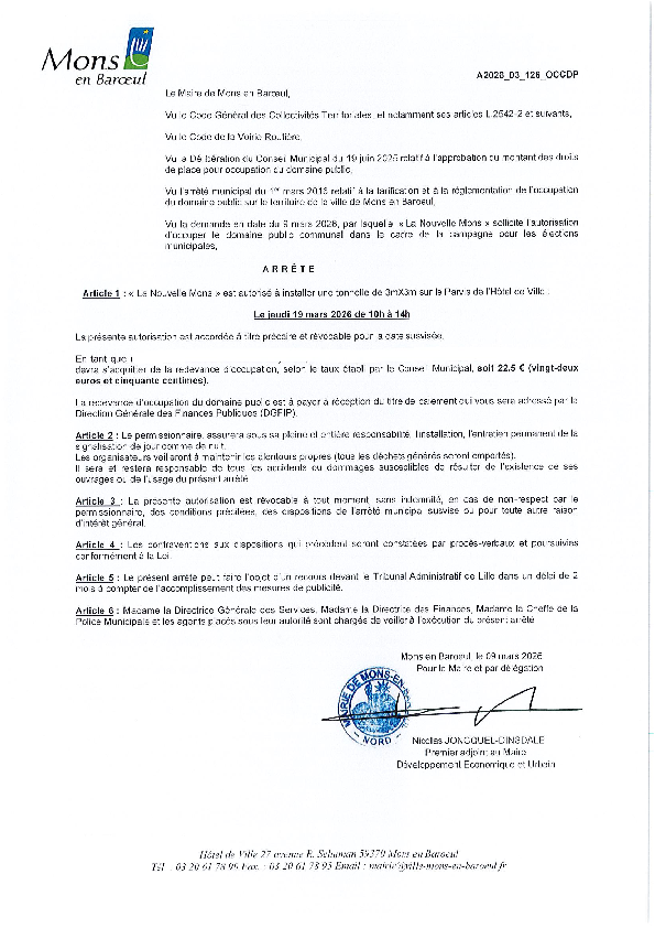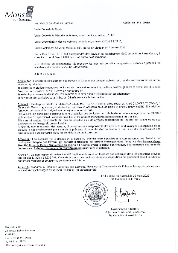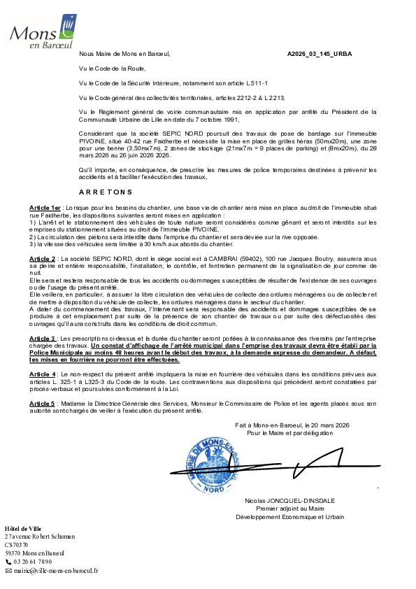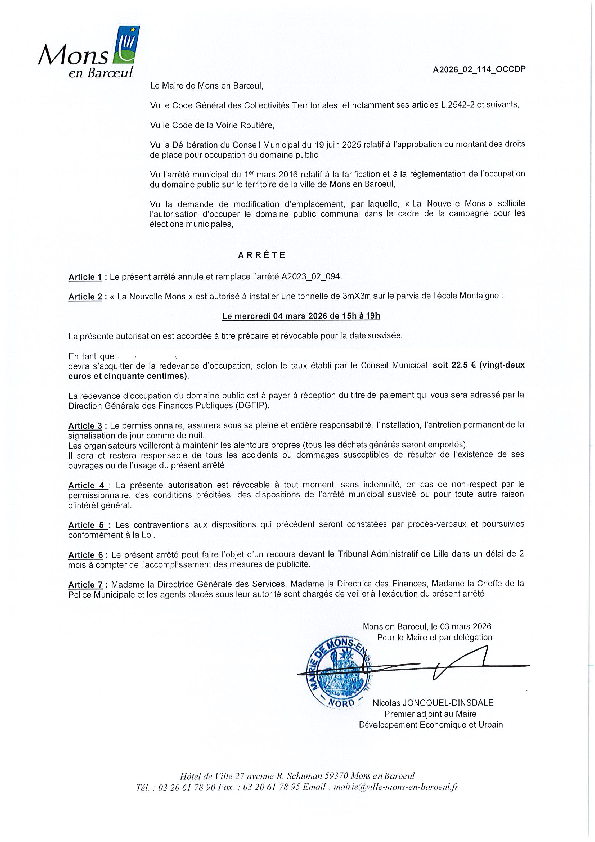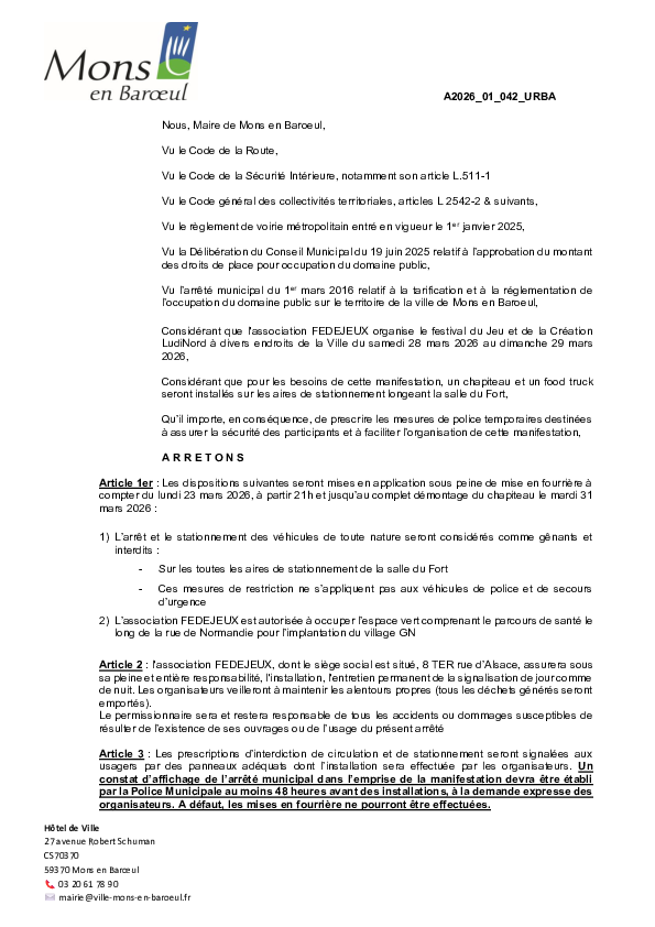 arrêté portant sur la fermeture provisoire du Fort de Mons en Baroeul