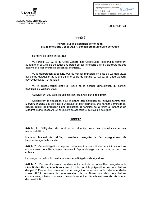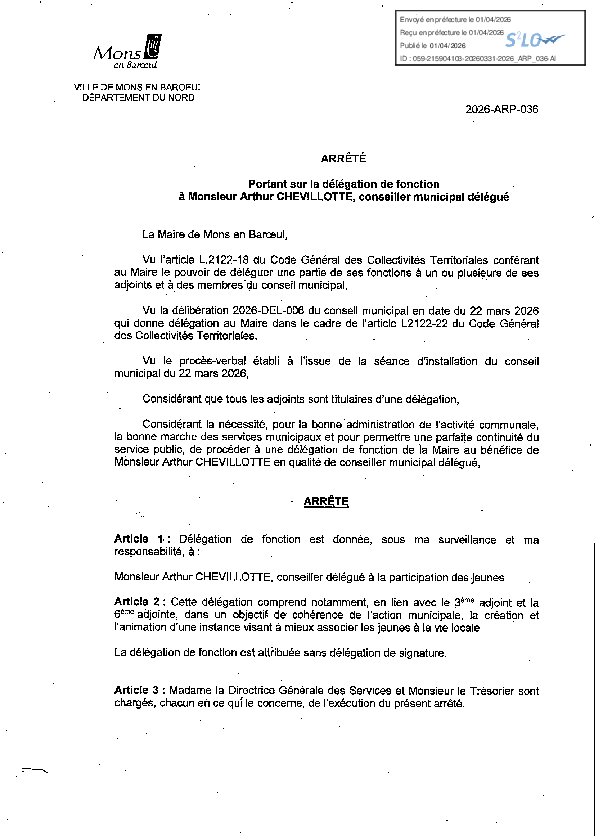 Délégation de fonction et de signature à M. Baptiste MENARD-3e adjoint