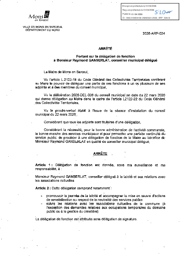 Délégation de fonction à M. Raymond GANSERLAT, conseiller municipal délégué