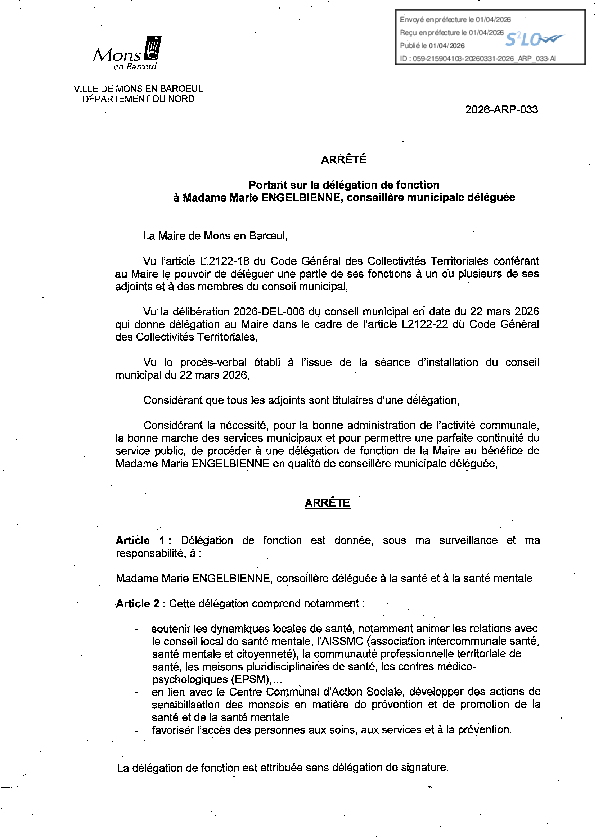 Délégation de fonction à Mme Marie ENGELBIENNE, conseillère municipale déléguée