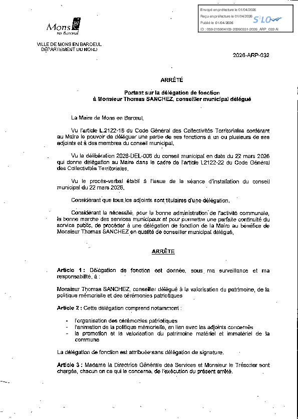 Délégation de fonction à M. Thomas SANCHEZ, conseiller municipal délégué