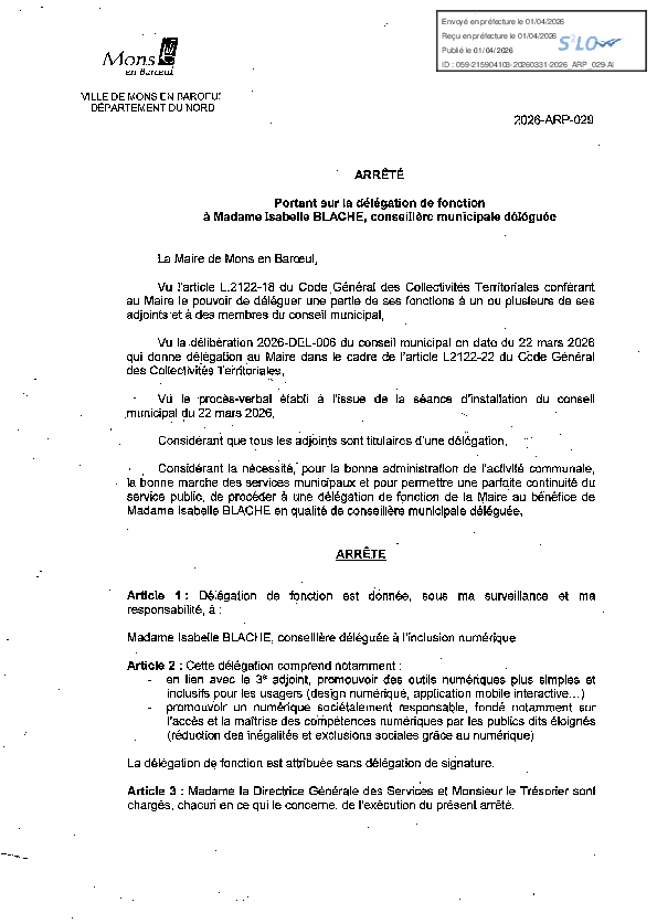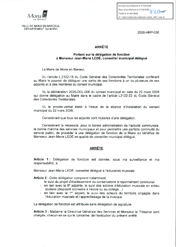 Délégation de fonction et de signature à M. Cédric BLOUME-1er adjoint