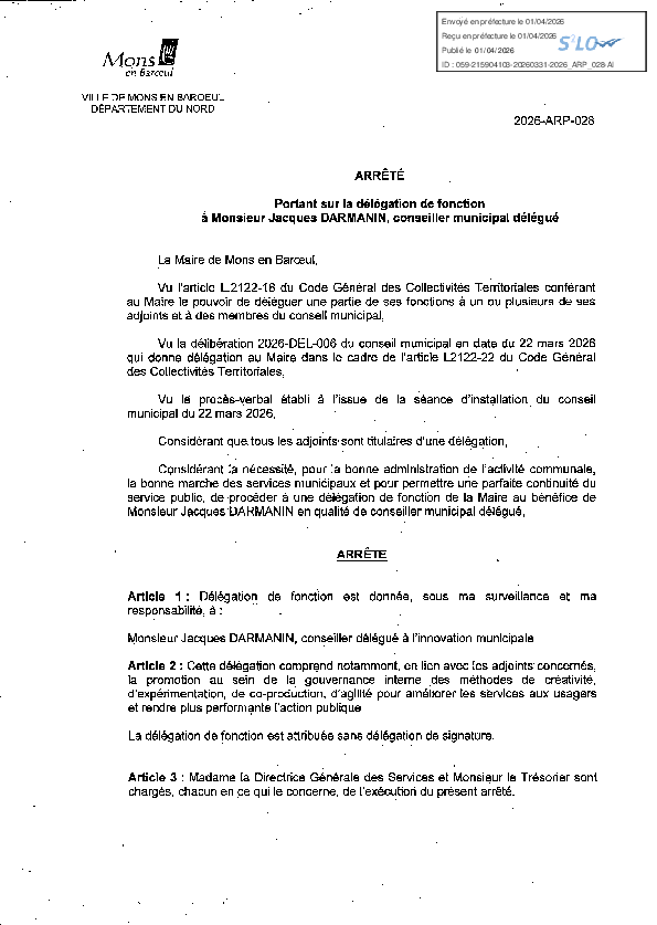 Délégation de fonction à M. Jacques DARMANIN, conseiller municipal délégué