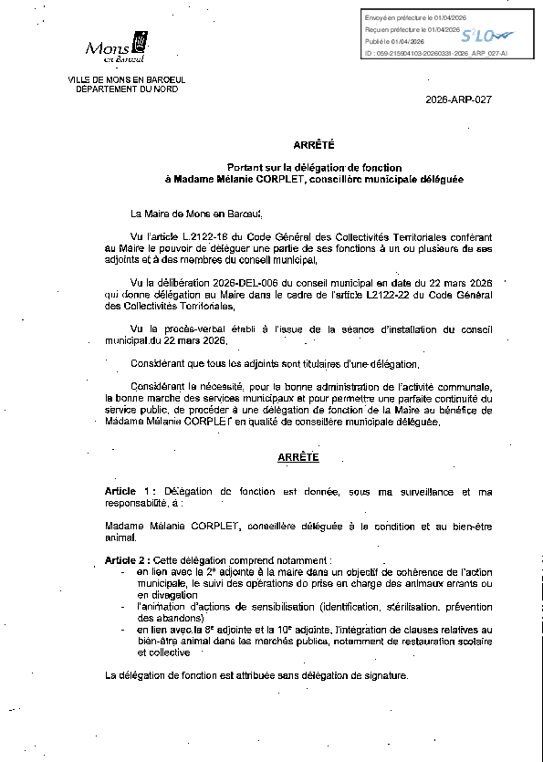 Délégation de fonction à Mme Mélanie CORPLET, conseillère municipale déléguée