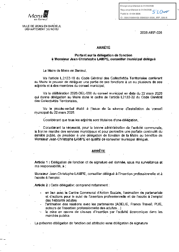 Délégation de fonction à M. Jean-Christophe LAMPE, conseiller municipal délégué