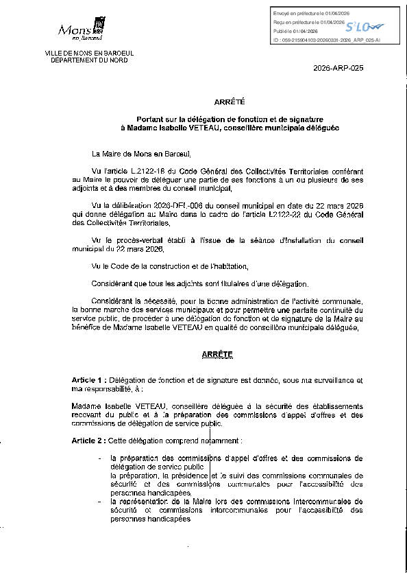 Délégation de fonction et de signature à Mme Isabelle DELILLE-8e adjointe