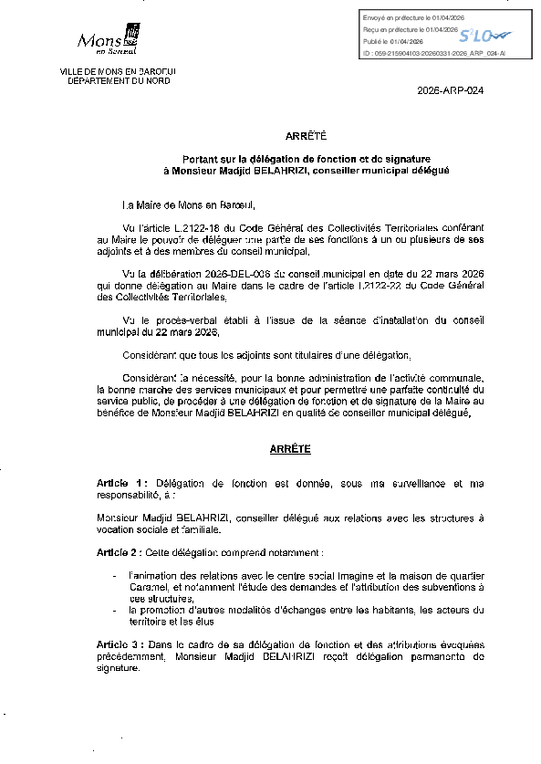 Délégation de fonction et de signature à M. Madjid BELAHRIZI, conseiller municipal délégué