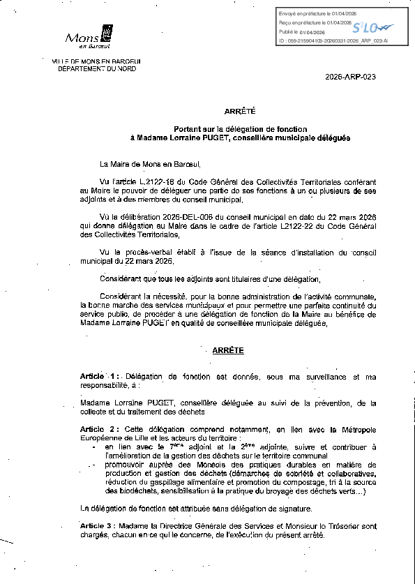 Délégation de fonction à Mme Lorraine PUGET, conseillère municipale déléguée