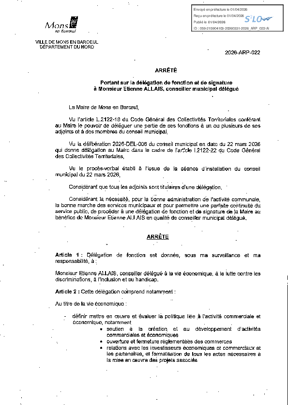 Délégation de fonction et de signature à M. Etienne ALLAIS, conseiller municipal délégué
