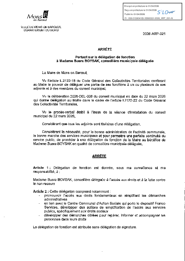 Délégation de fonction à Mme Busra BOYSAK, conseillère municipale déléguée