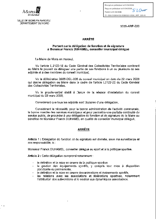 Délégation de fonction et de signature à M. Franck DUHAMEL, conseiller municipal délégué