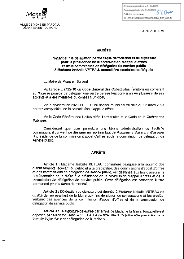 Délégation permanente de fonction et de signature pour la présidence de la CAO et de la commission de DSP à Mme Isabelle VETEAU, conseillère municipale déléguée