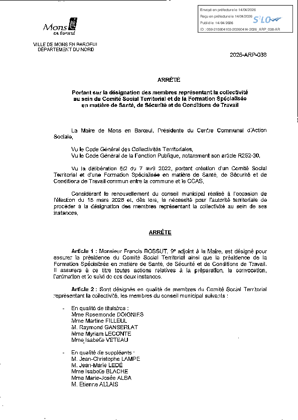 Désignation des membres représentant la collectivité au sein du Comité Social Territorial et de la Formation Spécialisée en matière de Santé, de Sécurité et de Conditions de Travail