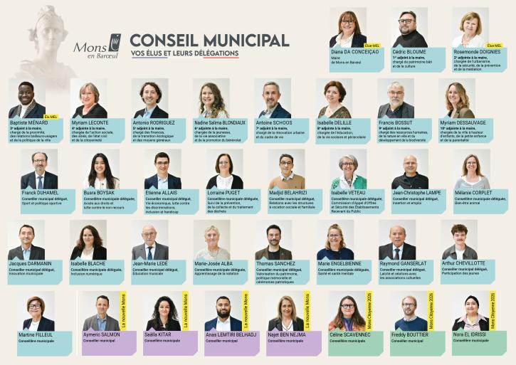 4 conseillers municipaux issus de la liste "La Nouvelle Mons" et 3 conseillers municipaux issus de la liste "Mons Citoyenne 2026" siègent également au sein du conseil municipal.